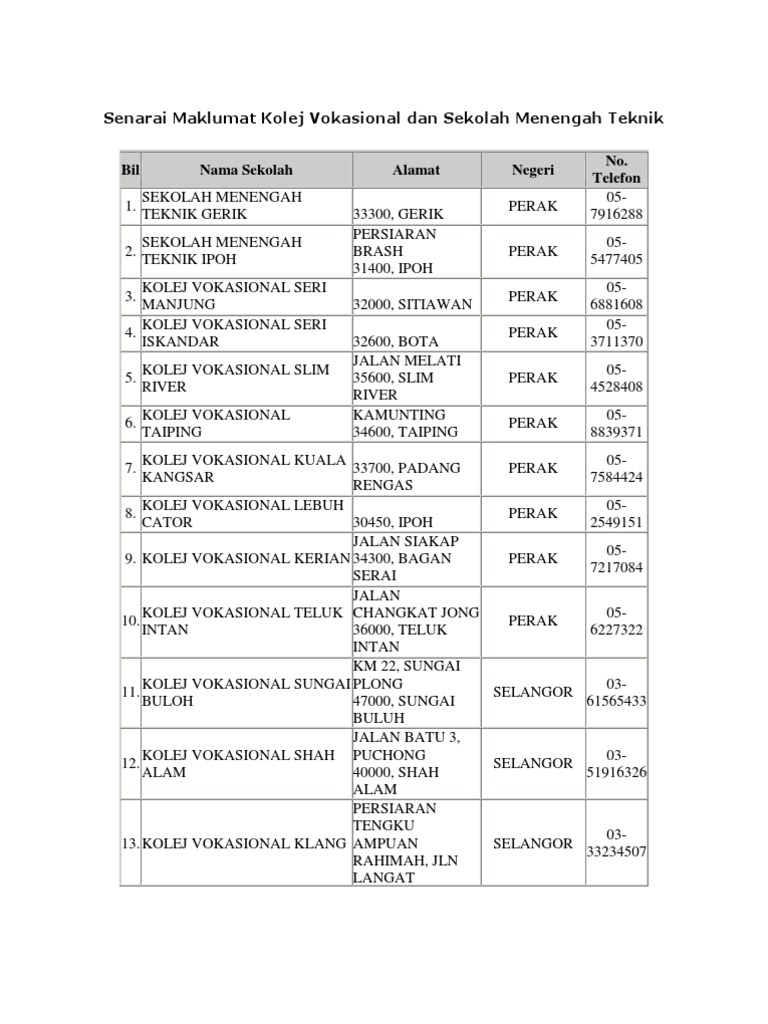 Senarai Maklumat Kolej Vokasional Dan Sekolah Menengah Teknik Pdf